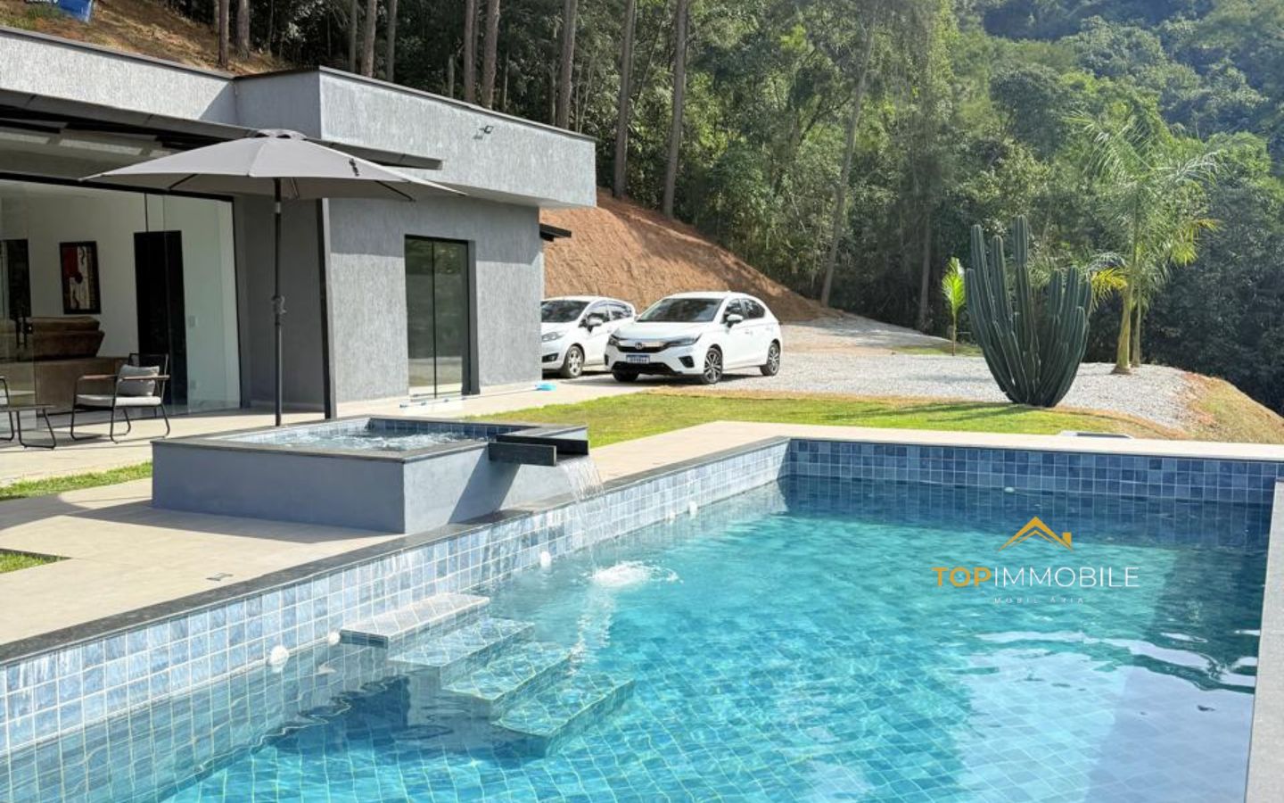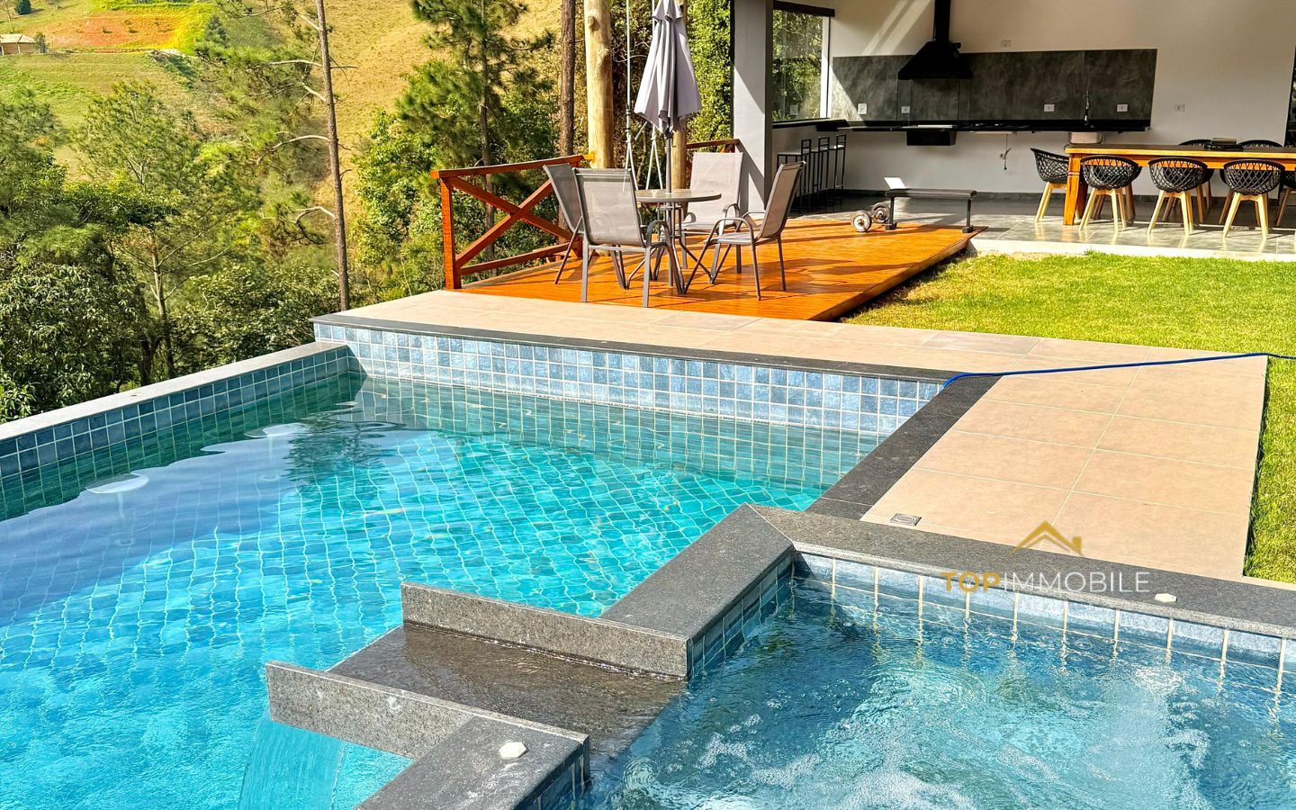 - Piscina de borda infinita com spa elevado e hidromassagem, que oferece uma vista deslumbrante da mata preservada.