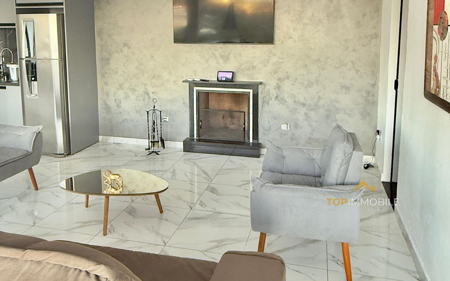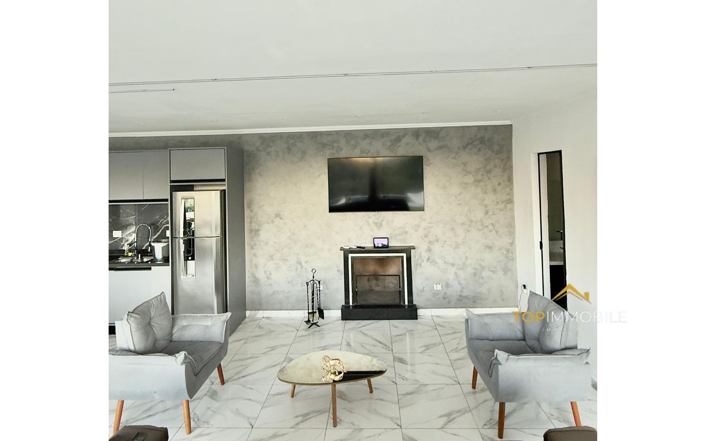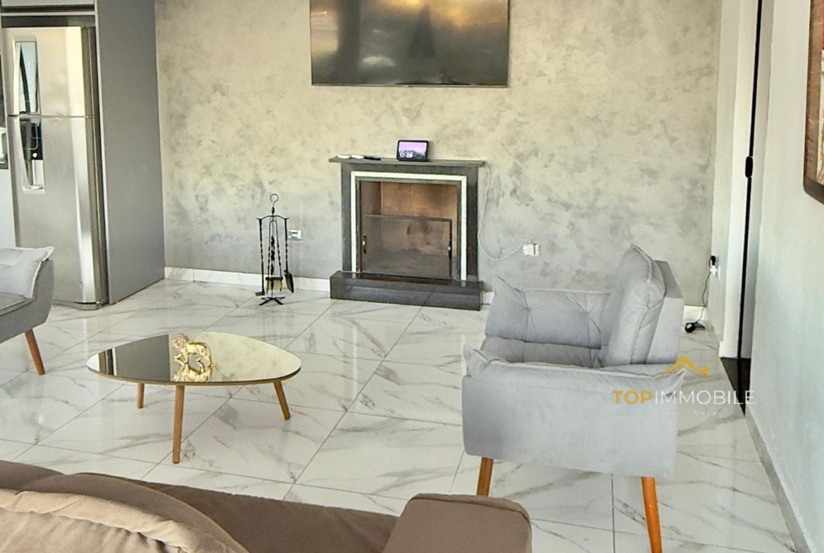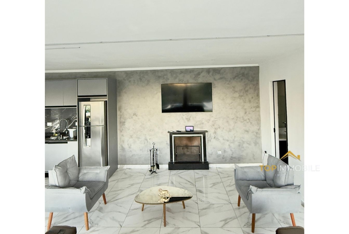 - Sala integrada com lareira, paredes de vidro e conceito aberto, permitem iluminação natural abundante e sensação de amplitude.